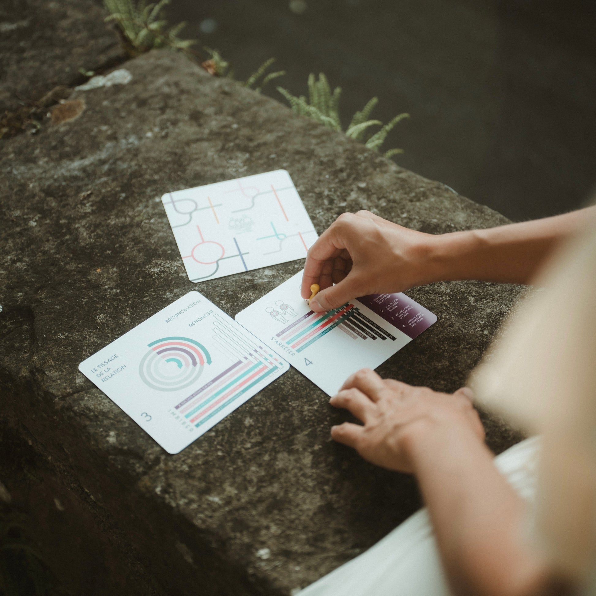 👋🏻 J‘ai découvert ces gestes qui calment par la méditation et la prière dans une situation de vie très critique. Peu à peu, j’ai découvert comment les enchaîner pour décupler leurs effets apaisants. Dans un deuxième temps, j’ai créé LE JEU avec toute une équipe à mes côtés pour transmettre ce savoir de façon ludique aux joueurs !